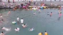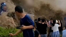 市民围观钱塘江大潮被浪花拍倒 抱着大树防冲走